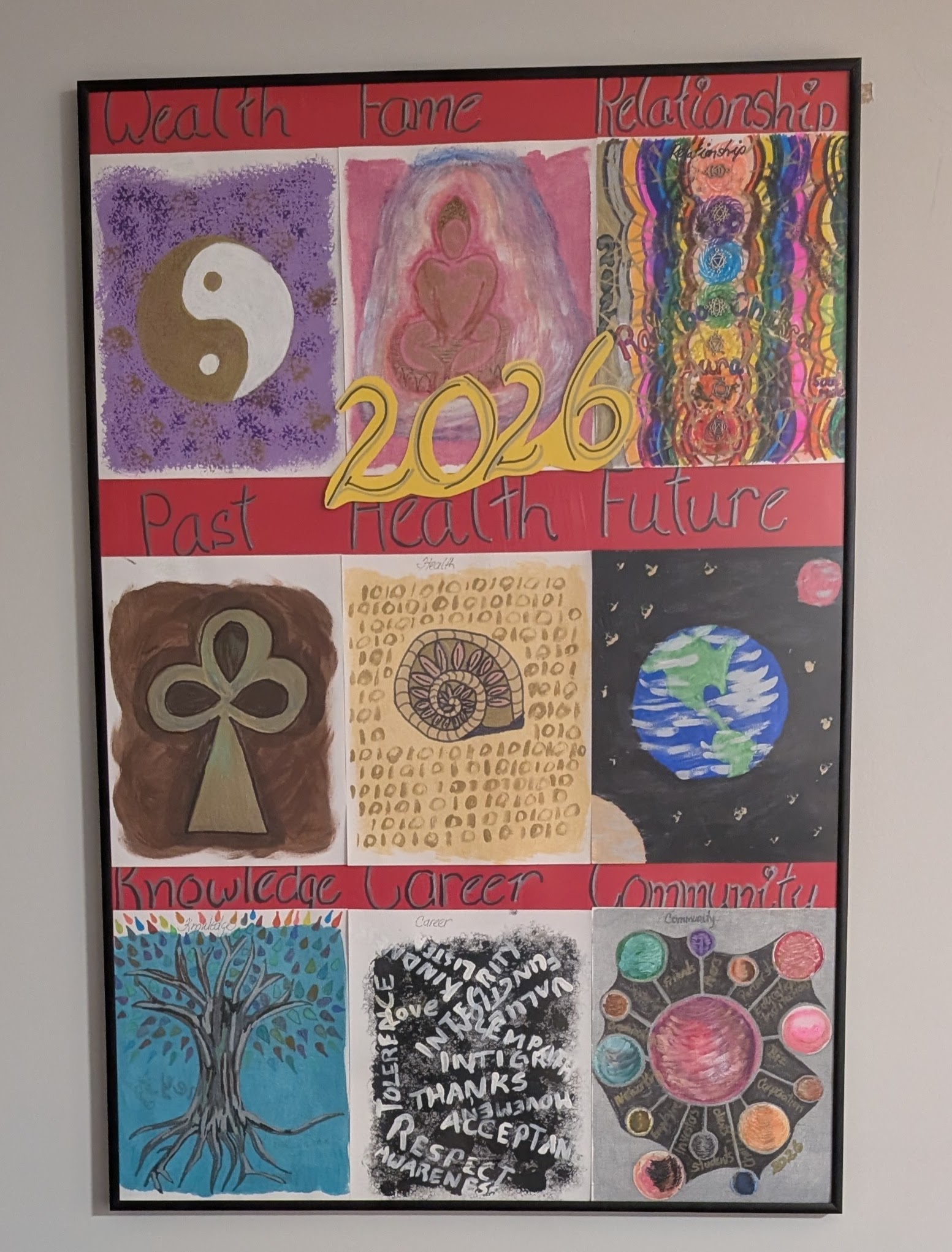 The nine life area goals identified in the poster above were painted as a creative personal connection to intentions in each area and framed last night as the calendar is about to shift into 2026. This poster is hung facing the door to my office/creative space as a visual reminder as I move about and sit at my desk. This interactive poster is placed prominently with the intention of manifesting life through creative expression in living and learning. It is a visual focus of intention for creative living in 2026 that expresses from a thoughtful core connection. It is my ‘Shining North Star’ guiding my 2026 experience. A Shining North Star that contains what is alive and meaningful in the present moment of reflection. Each year is a stepping stone on an elusive journey, and this poster identifies the present location of this North Star on this pathway. It creates groundedness in the spontaneity of living an interactive and innovative lifestyle.