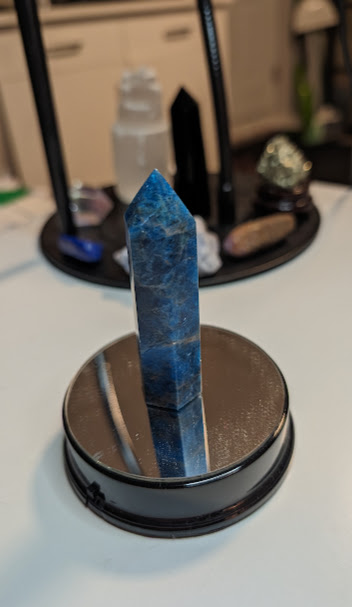Blue Kyanite encourages communication and self-expression. It is said to cut through fears and blockages, to support speaking one’s truth. This makes it valuable for public speakers and performers. It is suggested that it strengthens the voice and heals the throat and the larynx. This piece of blue kyanite was given to Renee in 2001 by a peer who partnered with her to open the first compassionate communication circle based on Dr. Marshall Rosenberg’s model and patterns as described in Nonviolent Communication.