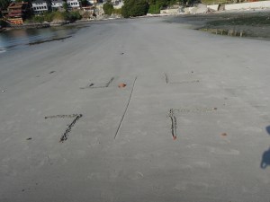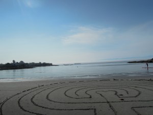 Once your labyrinth is drawn, take a few moments to engage in exploring the beach you are on for interesting pieces to place around the outside of the outer ring of your sand labyrinth.  You may find some treasure in the small pieces of wood that have become rounded and can be placed along to match the rounded edges of your outer ring.