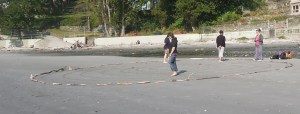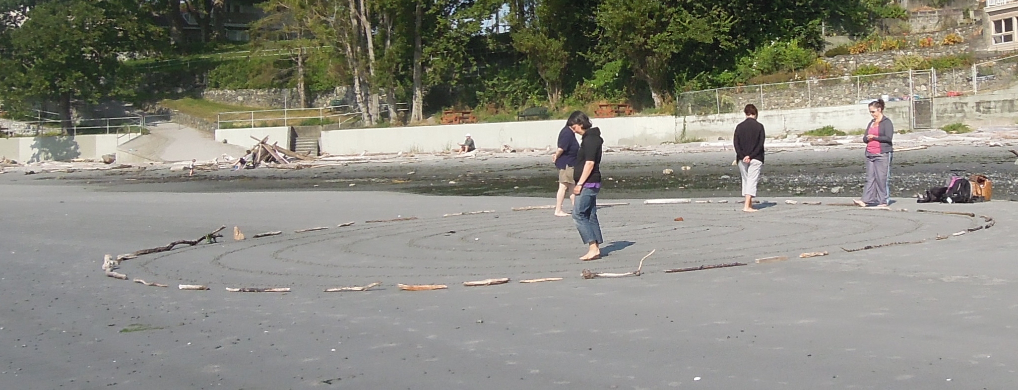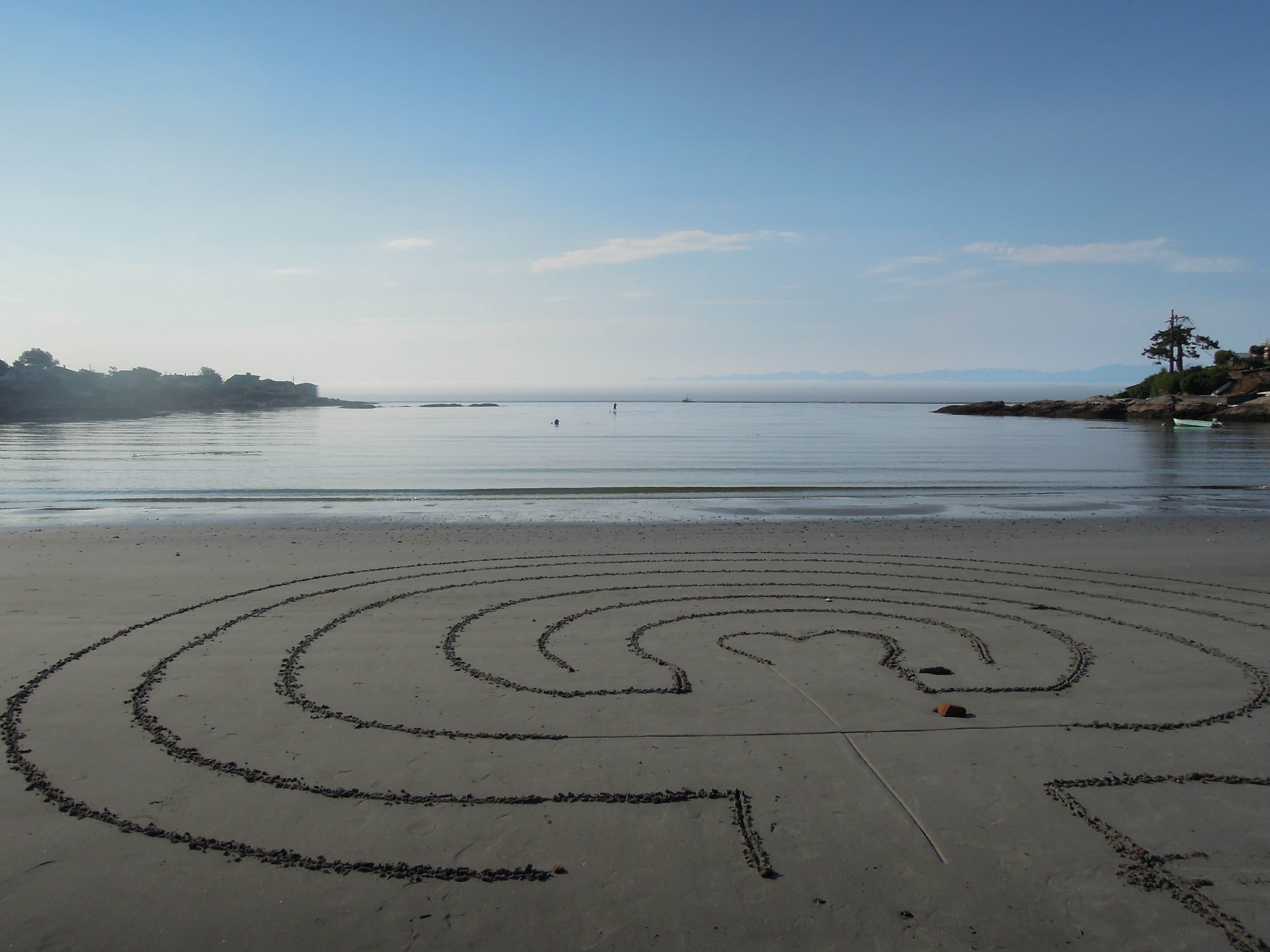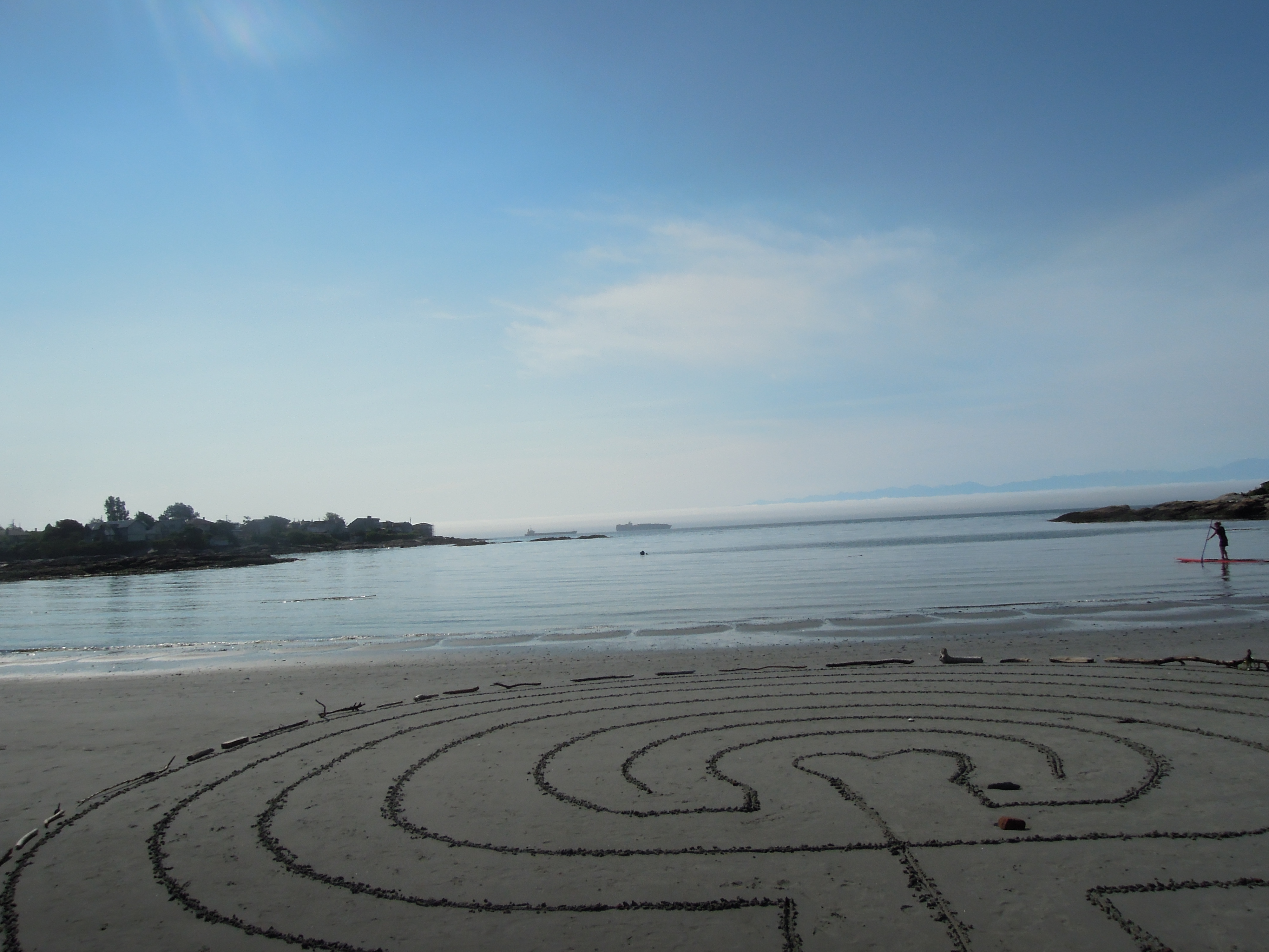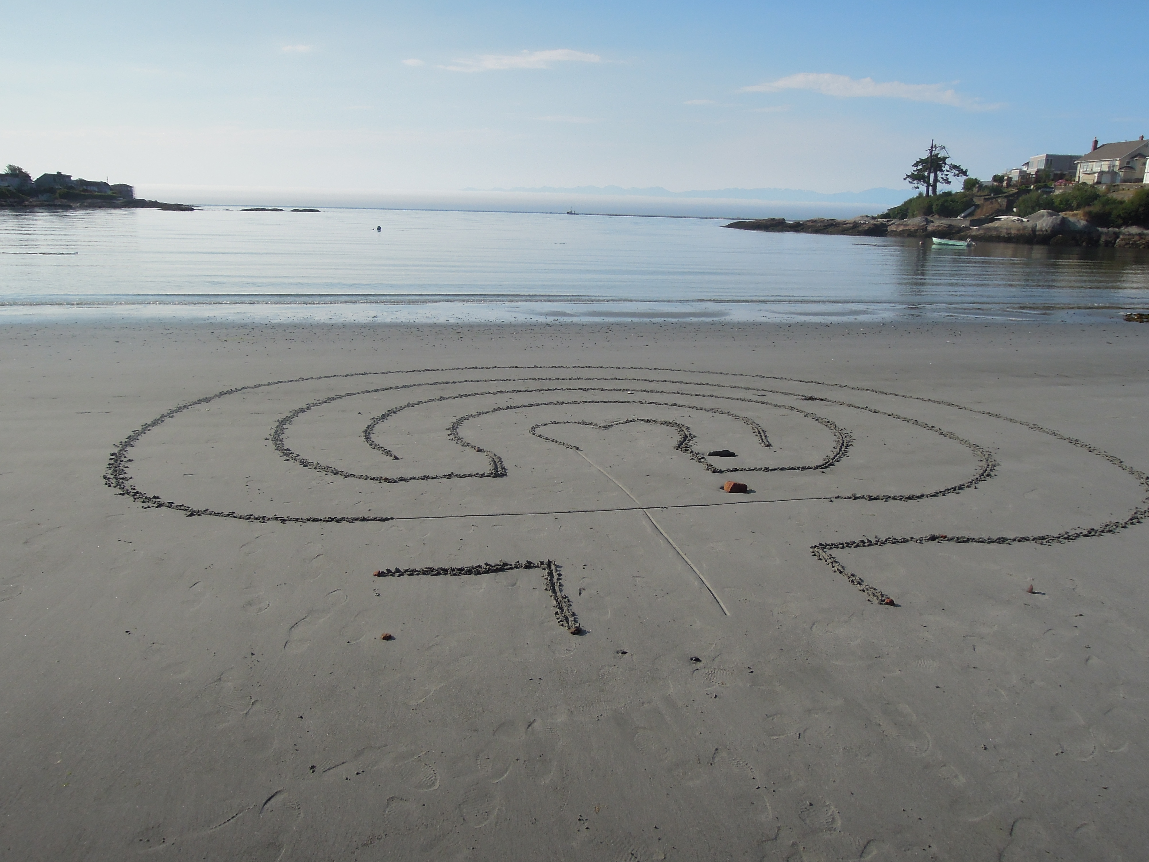 Once your labyrinth is drawn take a few moments to engage in exploring the beach you are on for interesting pieces to place around the outside of your outer ring of your sand labyrinth. You may find some treasure in the small pieces of wood that have become rounded and can be placed along to match the rounded edges of your outer ring.